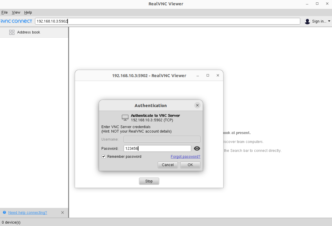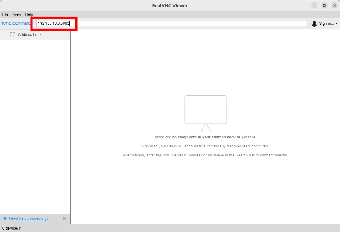 VNC Viewer를 실행하고 상단 입력창에 다음 주소를 입력합니다: