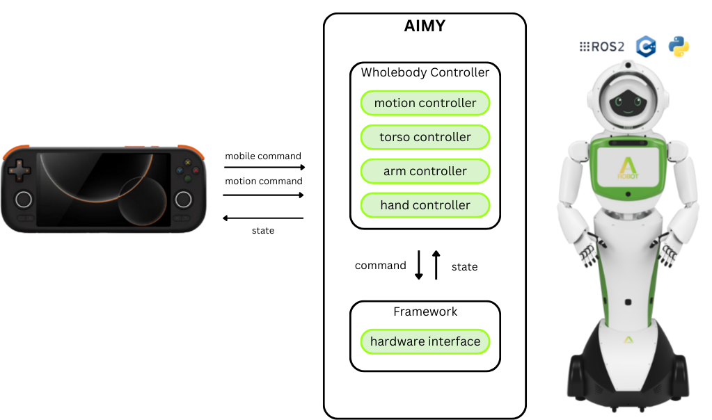 • wholebody controller모듈은 모션 명령을 처리하여 framework 모듈로 전달됩니다.