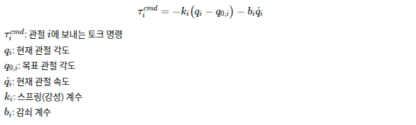 각 관절 (i)에 대해, 컴플라이언스 컨트롤러는 아래와 같은 법칙으로 토크를 만듭니다.