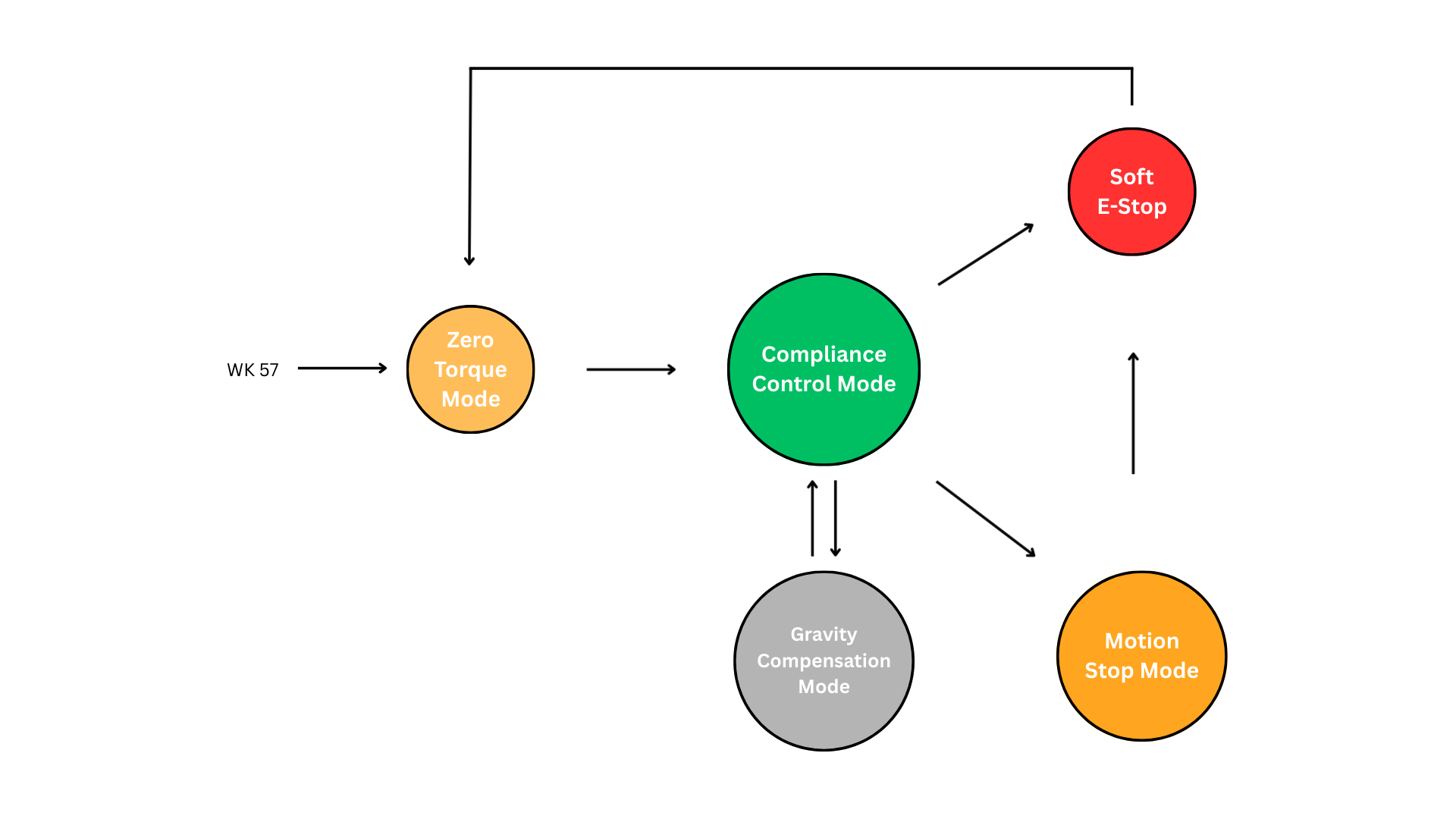 위에 나열된 경로 외의 조합(예: Zero Torque에서 바로 Gravity로, Motion Stop에서 바로 Compliance로 등)은 FSM 상에서 허용되지 않으며, 요청하더라도 실제 상태는 전환되지 않습니다.